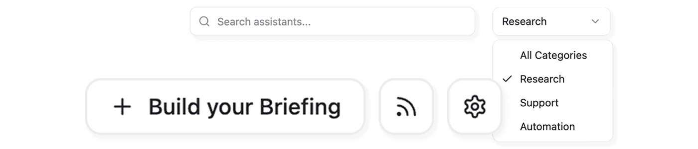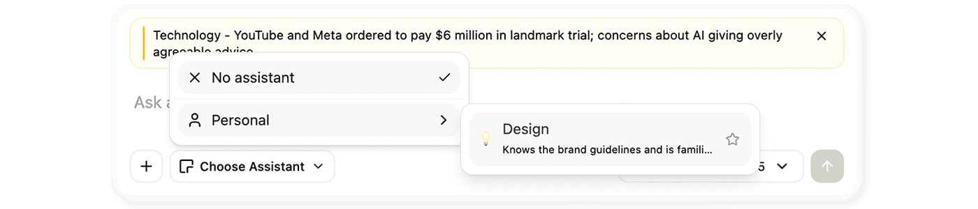 Assistenten mit Labels organisieren, um sofort den richtigen Experten zu finden. Verbinden Sie Ihre Assistenten mit Radar, Integrationen oder Ihrem Knowledge Hub, um den richtigen Kontext für Ihren Output bereitzustellen.