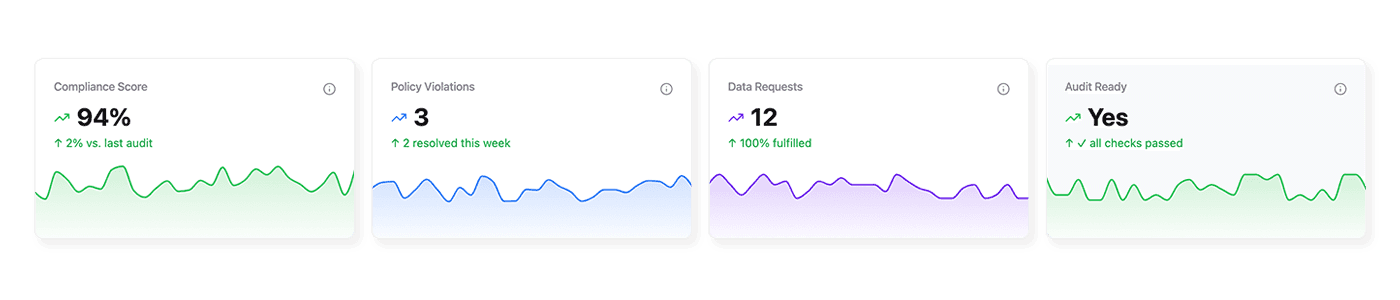 Compliance-Scores, Richtlinienverstöße und Datenanfragen überwachen. Jederzeit audit-bereit durch Governance-Tracking in Echtzeit.