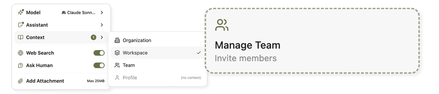 Verwalten Sie den Zugang zu spezifischem Wissen nach Organisation, Workspace oder Team. Nutzen Sie Ihr Wissen in der täglichen Arbeit: Wählen Sie die passende Wissensdatenbank im Chat, verbinden Sie sie mit Assistants oder Agents.